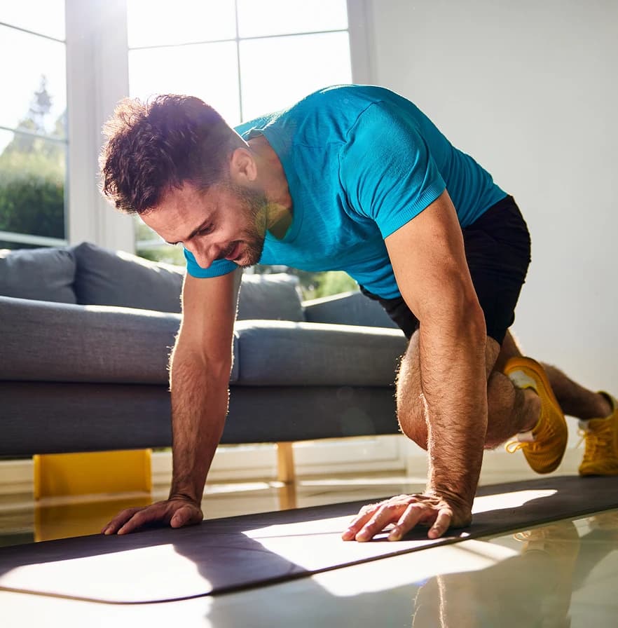 - Коснись ладонями пола и отпрыгни стопами назад таким образом, чтобы тело переместилось в положение классической планки.