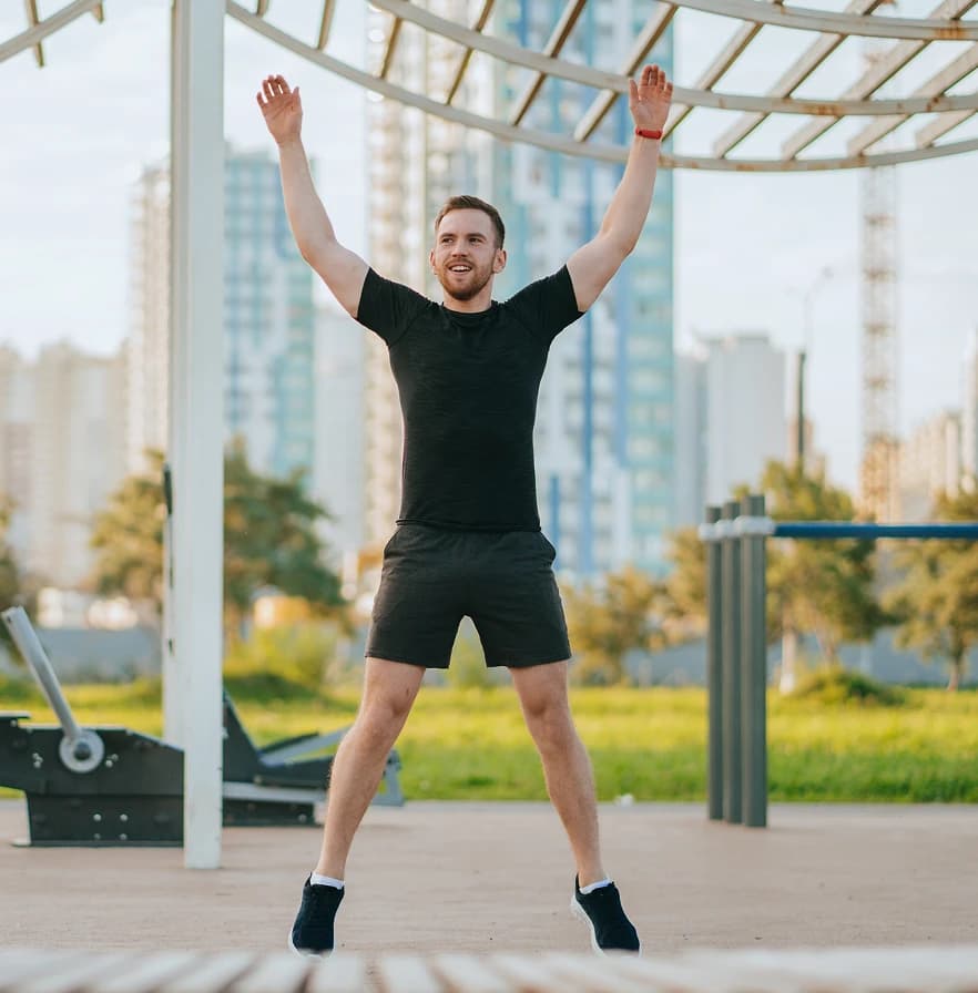 - Выполняя прыжок, разведи ступни на ширину плеч, а руки – в стороны.